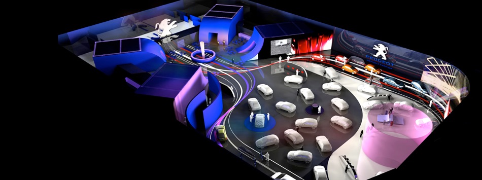Design et conception artistique, projet pour Peugeot, Rome Evènement: lancement de nouvelle voiture. Showroom et convention.